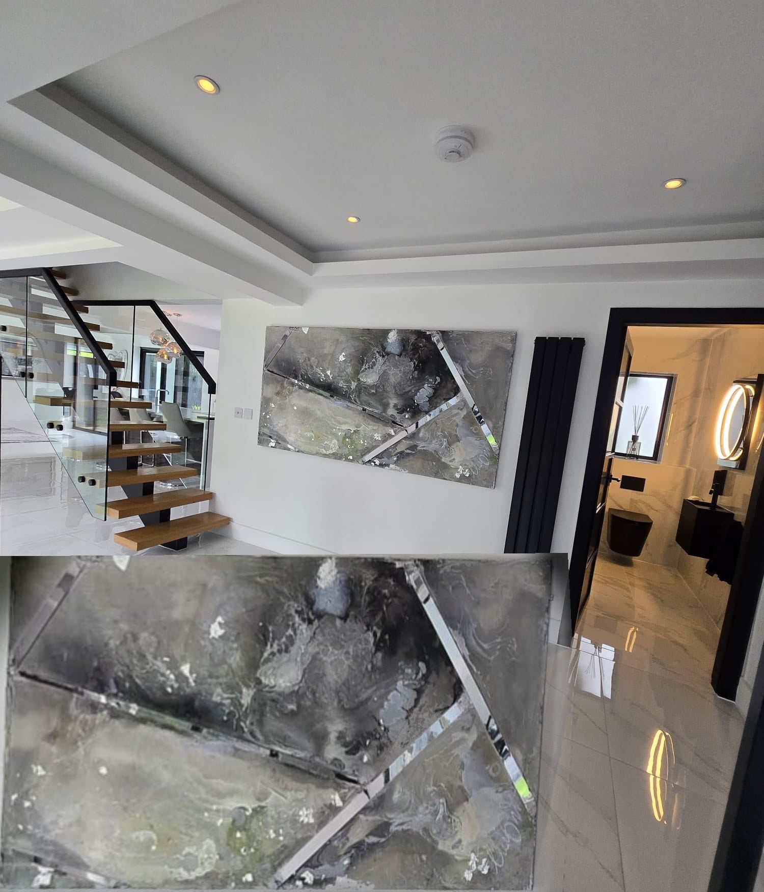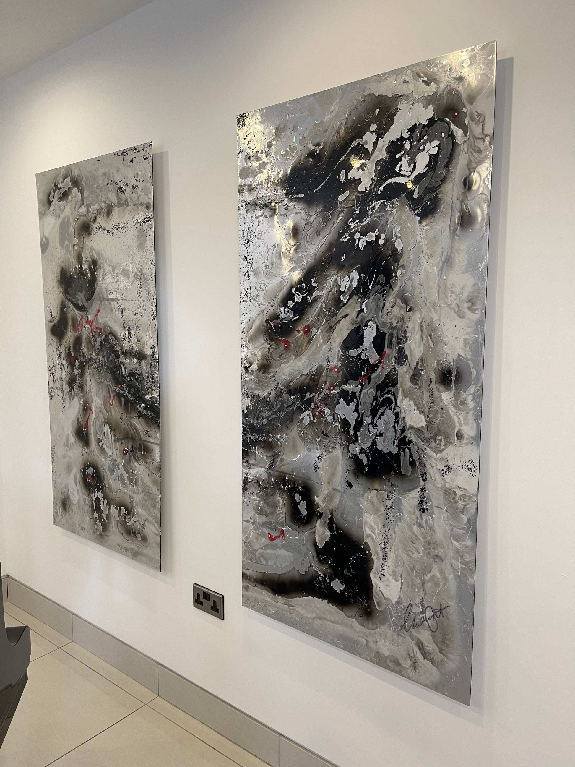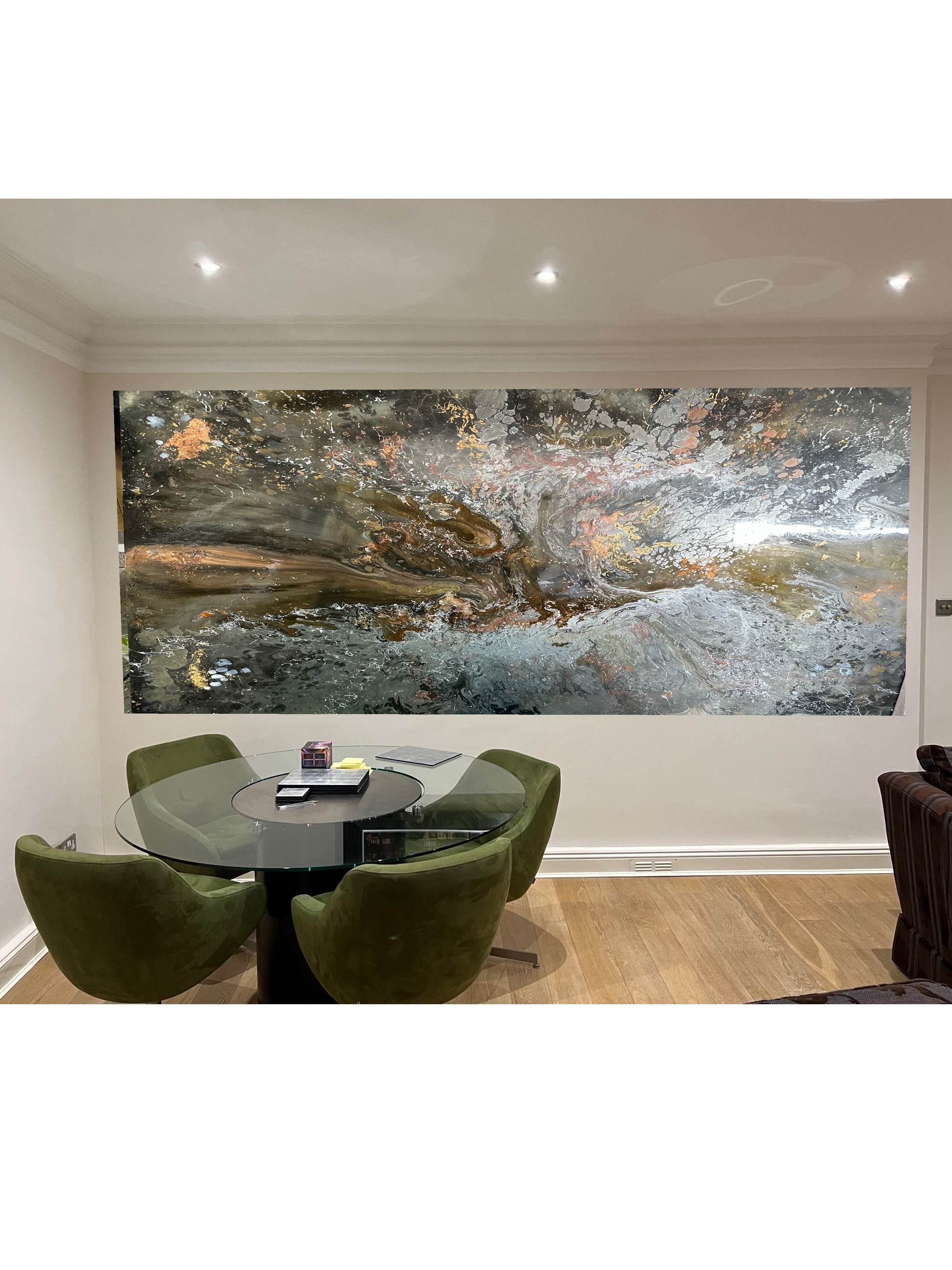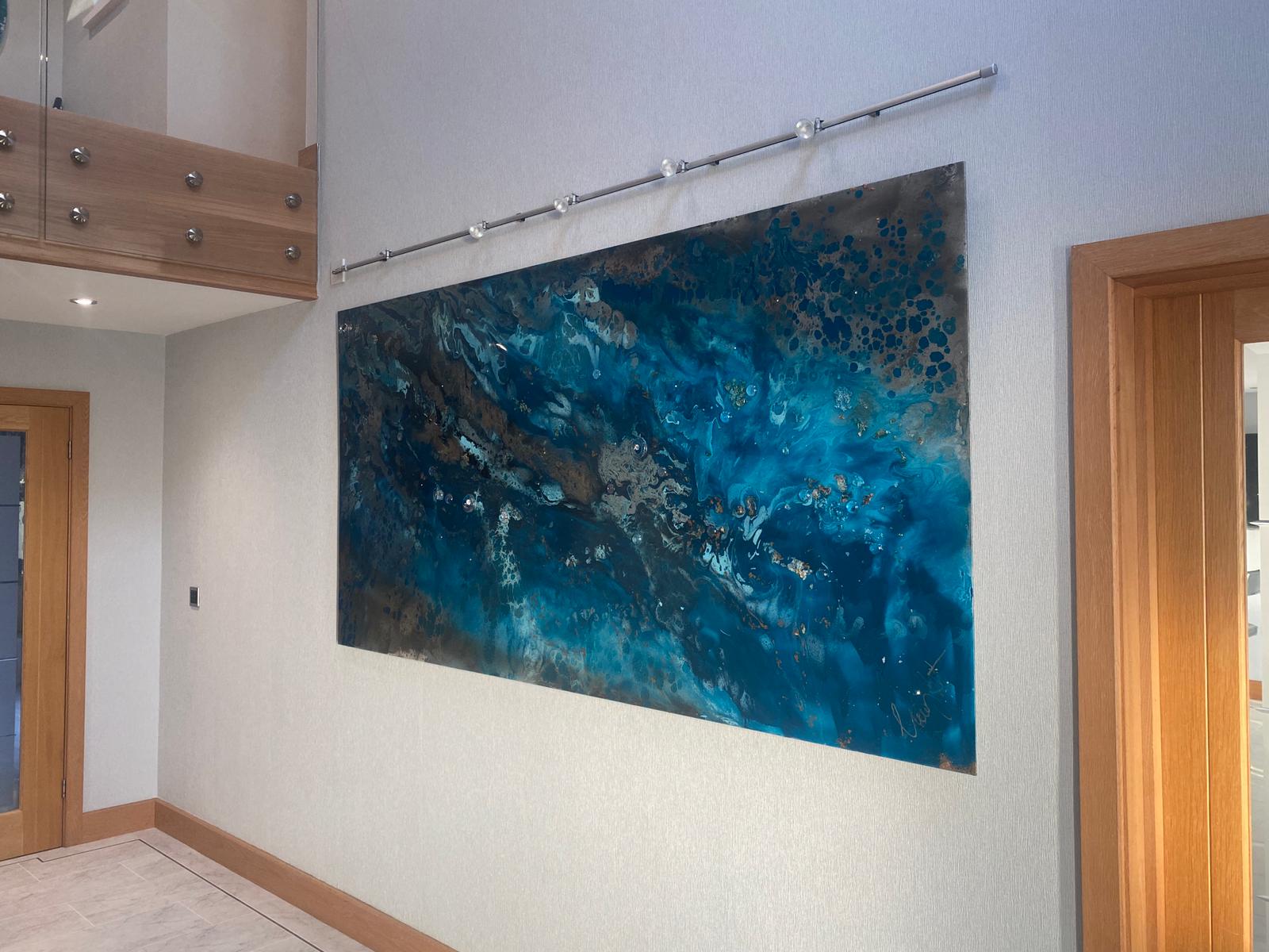 Bespoke Resin marble effect art installations incorporating texture , metallic leaf, acrylics. Created in colours of your choice . Panels start at 150 cm x 75 cm up to 3.5 m x 1 .5 m and any size in between